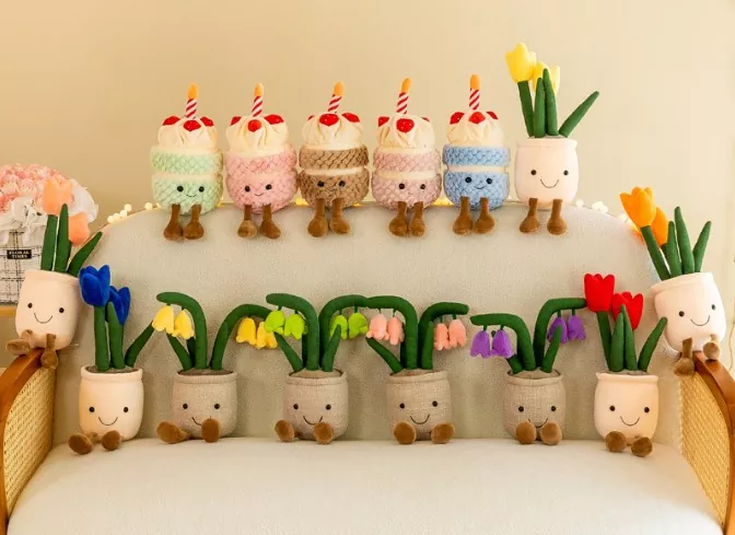 Thiết kế tổng thể của con búp bê sang trọng trong chậu gợi nhớ đến một chậu cây thật, có một cơ sở giống như hoa được phủ lên trên một yếu tố "cây" sang trọng. Một số giống với mọng nước, những người khác giống với cỏ, và các hình dạng khác nhau. Phối màu độc đáo của con búp bê sang trọng này khiến nó khác biệt với các chậu cây thông thường, khiến nó trở nên nổi bật hơn. Cho dù được đặt trong nhà hoặc văn phòng của bạn, nó sẽ trông dễ dàng và thêm một liên lạc thư giãn.