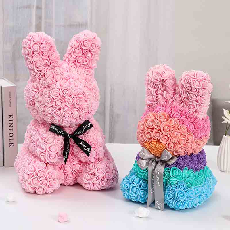 25cm và 40cm là kích thước chính của thỏ hoa hồng. Mô hình 25cm là nhỏ và tinh tế, phù hợp cho vị trí máy tính để bàn hoặc đồ lưu niệm, chẳng hạn như các hộp quà phù hợp là đồ lưu niệm cho các hoạt động của công ty; Mô hình 40cm có tác động trực quan hơn, được bao phủ bởi hàng trăm hoa hồng vĩnh cửu, phù hợp cho các cảnh như sân khấu chính đám cưới và trang trí tập trung của bữa tiệc. Cả hai mô hình đều được làm thủ công để đạt được sự khác biệt chi tiết, đảm bảo rằng mỗi con thỏ có kết cấu và màu sắc hơi khác nhau, mang lại cho sản phẩm một thuộc tính "độc đáo".